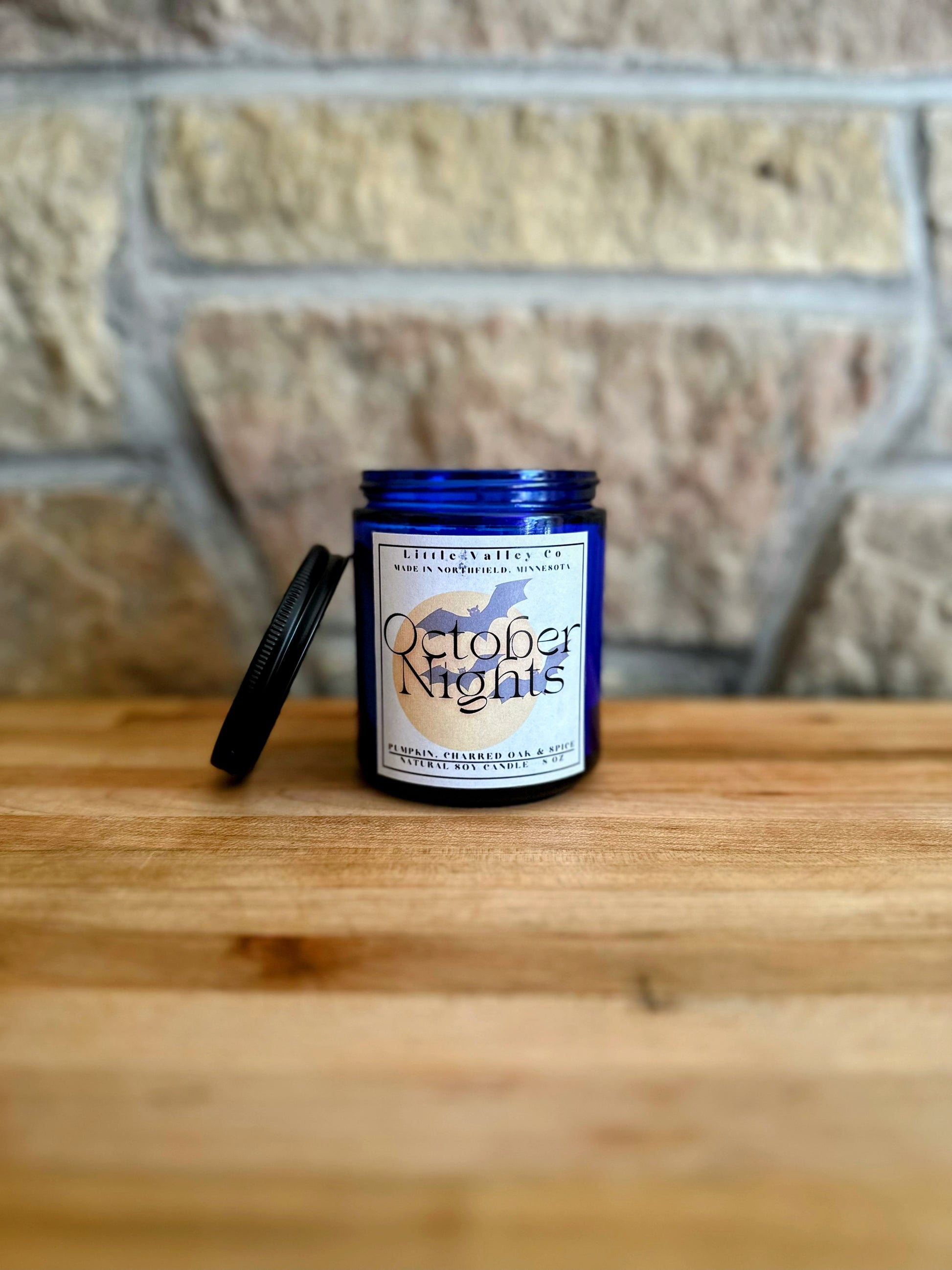 This candle is made with organic soy wax, a cotton wick, and luxury non-toxic fragrance oil and is in an 8 oz. sapphire blue glass jar with a flat black lid. It will burn for up to 45 hours.